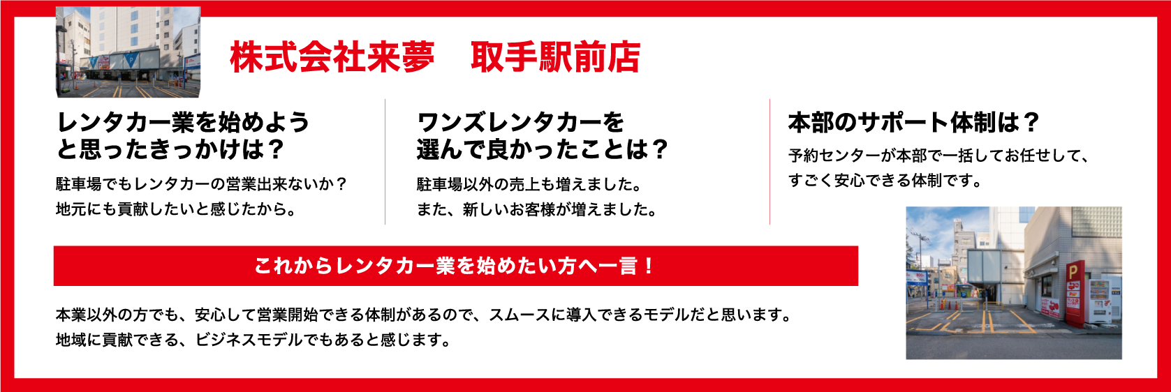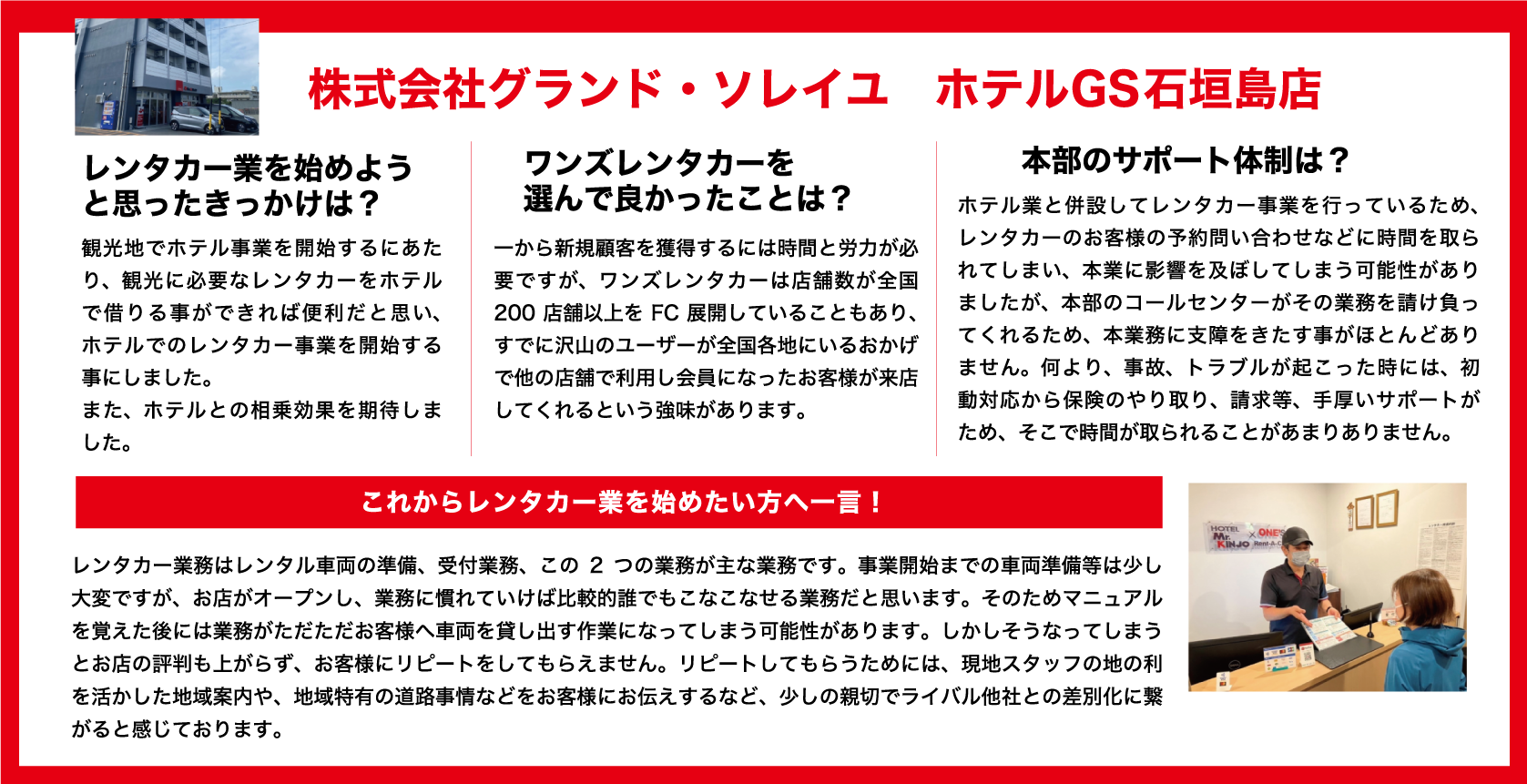 本部フルサポートセンターのフォローがあるため、収容台数30規模、内レンタカー保有10台程度であればワンオペでの運営が可能です。