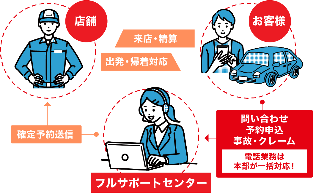 ユーザー様からの予約の問い合わせ、出発後の事故トラブル対応、更に未払い催促、運営支局への実績報告まで幅広く支援します。