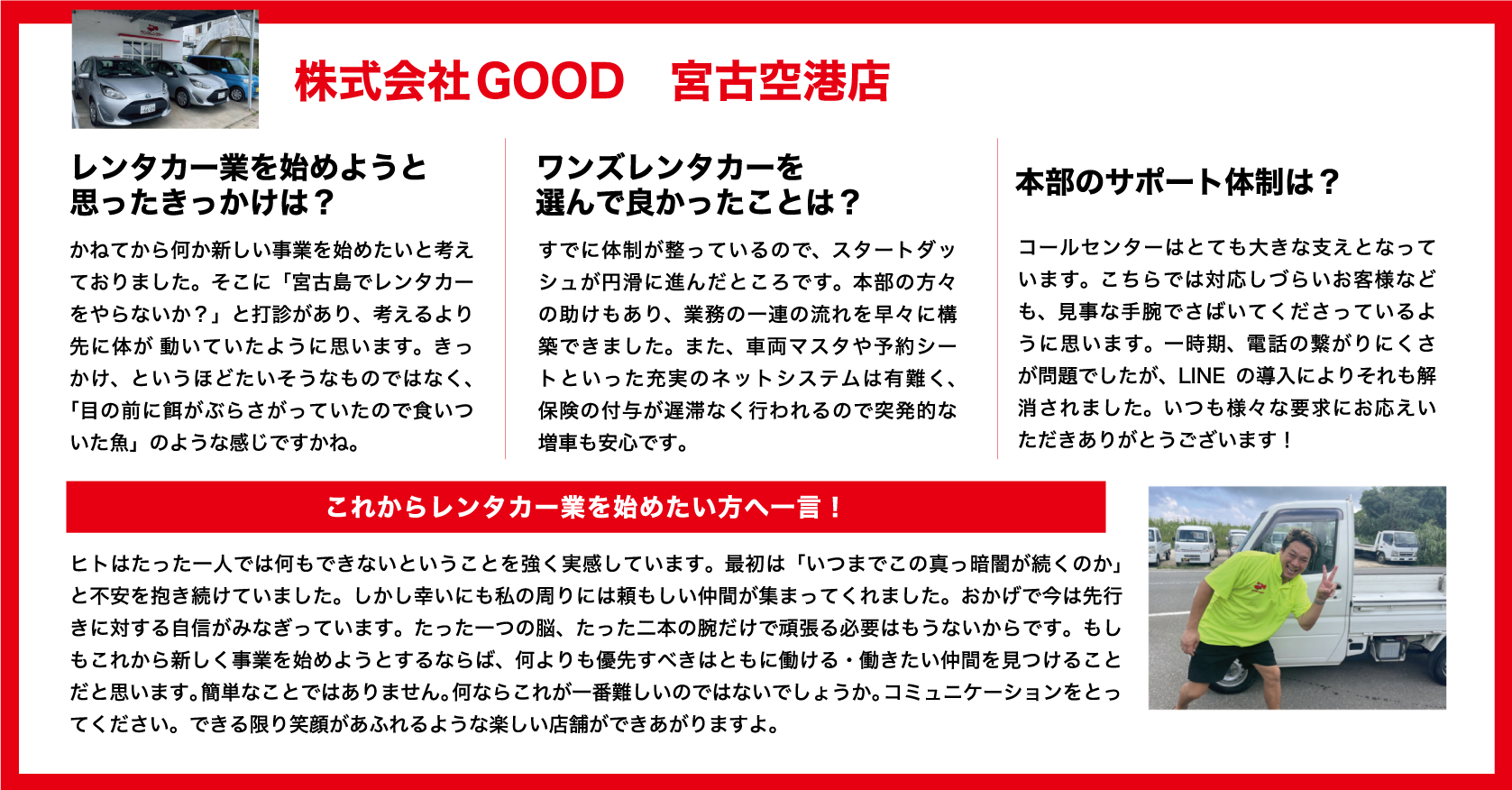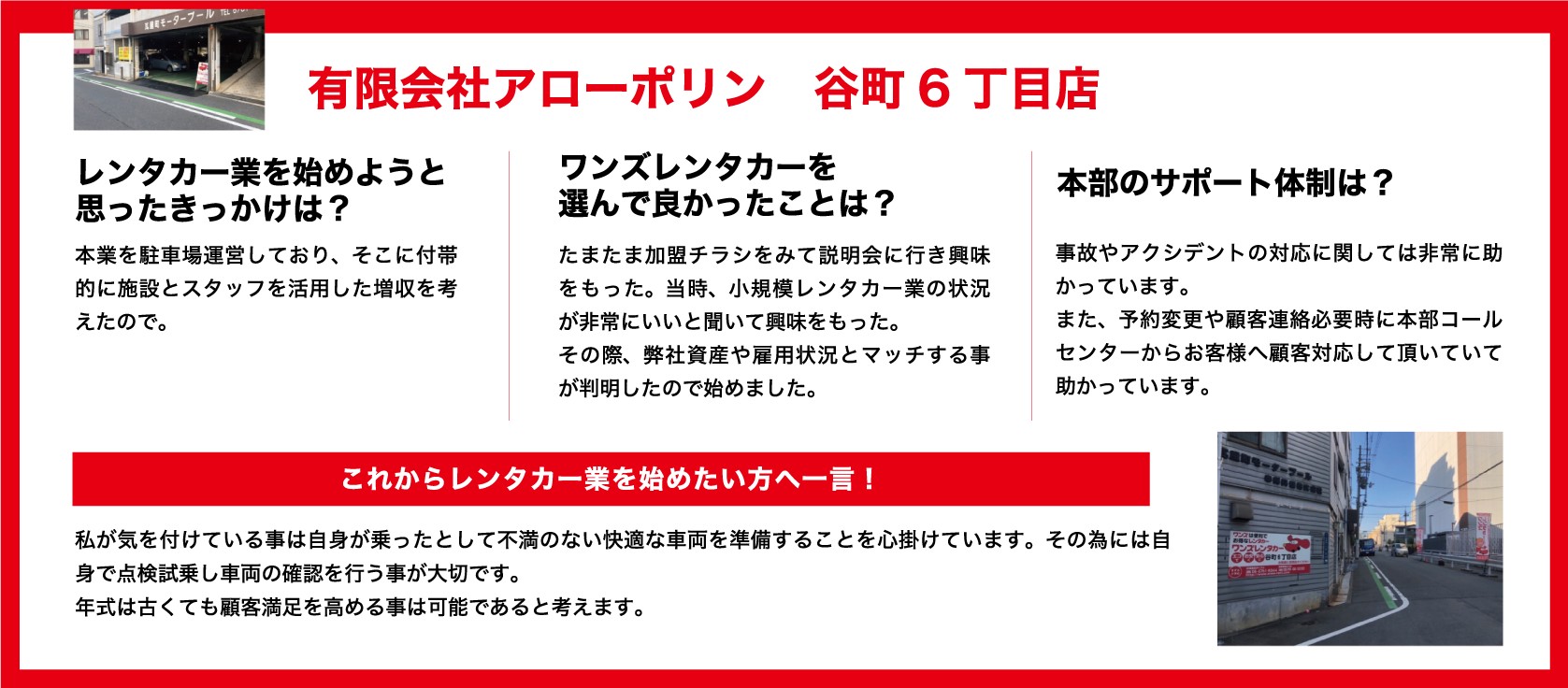本部フルサポートセンターのフォローがあるため、収容台数30規模、内レンタカー保有10台程度であればワンオペでの運営が可能です。